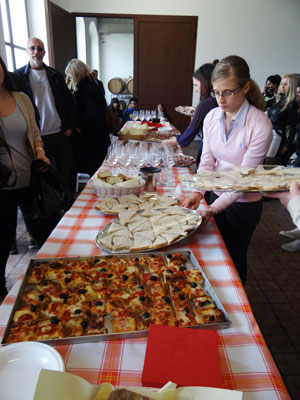 Ed eccoci all’highlight della nostra visita…finalmente si beve (e si mangia)! L’Azienda Vinicola, situata a Monforte d’Alba, infatti, ha organizzato per noi una meravigliosa sessione di wine-tasting, e in un’atmosfera familiare tutta italiana abbiamo avuto modo di degustare tutti i vini prodotti dall’Azienda Aldo Clerico: Dolcetto, Barbera, Nebbiolo, e due tipi di Barolo, accompagnati da un pranzo preparato proprio dai proprietari (i genitori di Aldo e sua moglie) a base di formaggi e salumi caserecci, frittate e pizza fatte in casa.