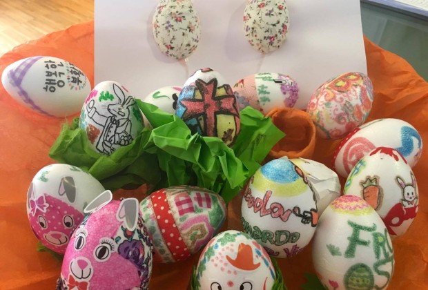 Ieri pomeriggio abbiamo organizzato un laboratorio creativo a Scuola. In occasione della Pasqua in arrivo, un gruppo di studenti ha decorato piccole uova di polistirolo con colori e adesivi. Ognuno ha scritto Buona Pasqua nella propria lingua e usato molta creatività.